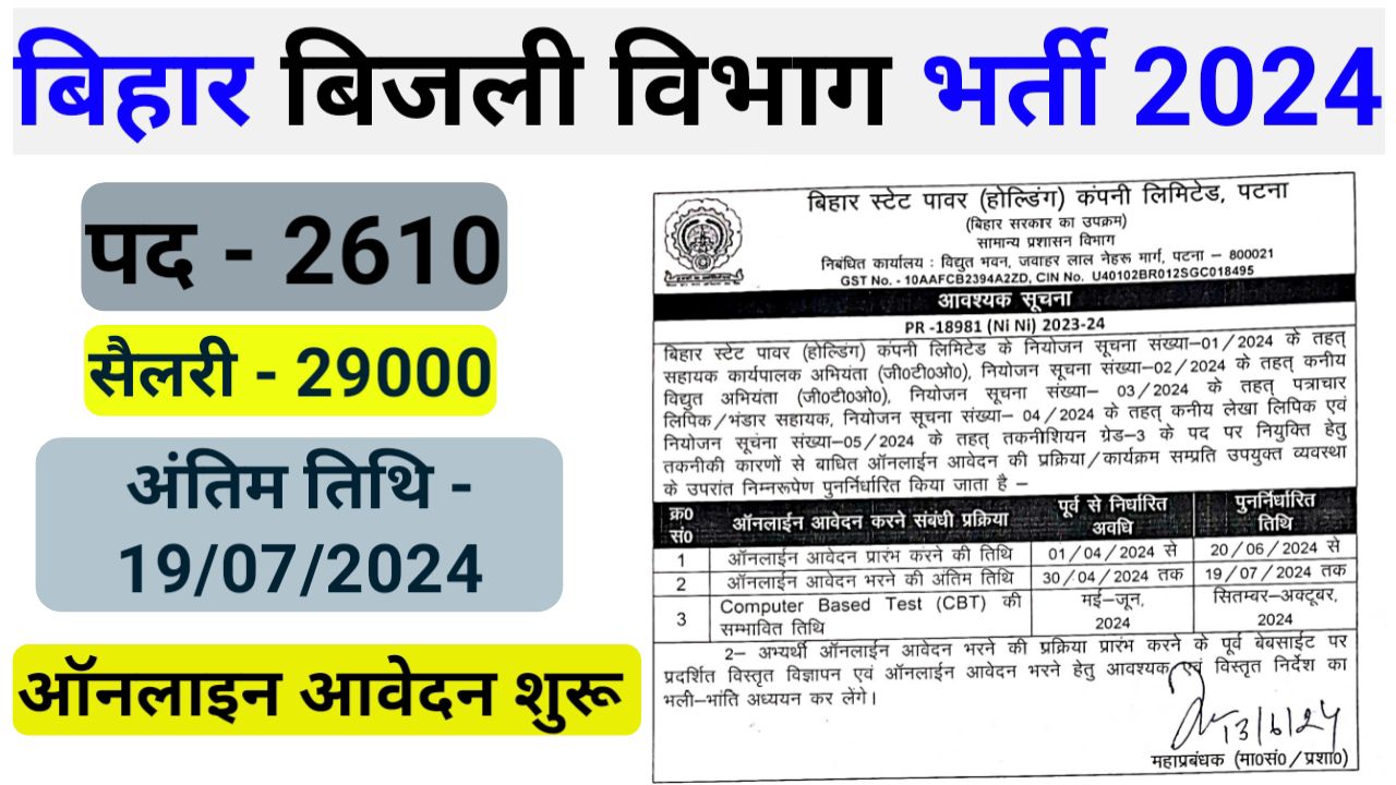 Bihar Bijli Vibhag Recruitment 2024, विद्युत विभाग में 10 वीं पास जल्दी करें आवेदन,अंतिम तिथि 19 जुलाई